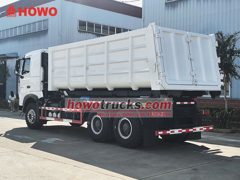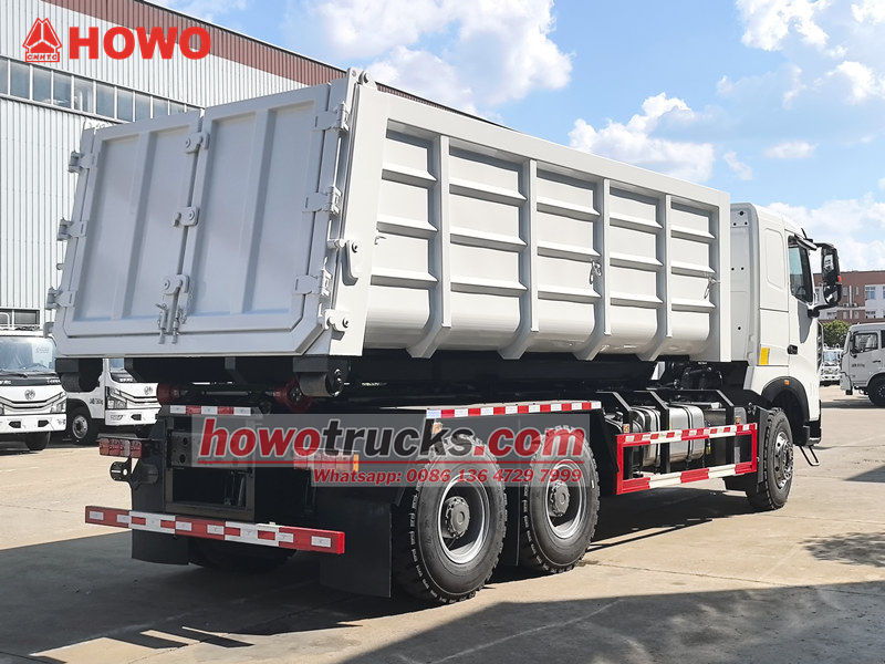 ●HOWO 20 тонналык илгичтүү жүктөгүч жүк ташуучу унаасы негизинен илгич рычагын иштетүү үчүн гидравликалык системага таянат, ал таштанды челектерин жүктөө, түшүрүү жана ташуу иштерин аяктайт.
