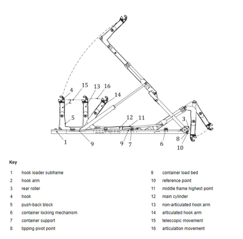 10 тонналык жүк ташуучу унаанын үстүнкү конструкциясынын өзөгү гидравликалык илгич рычагдан, рамадан жана бекитүүчү механизмден турат. Гидравликалык система илгич рычагын созуп жана кыйшайтып, тиешелүү таштанды челекти так кармап турат. Механикалык байланыш челекти рамага жылмакай тартып, бекитет. Үстүнкү конструкция жогорку бекем болоттон жасалган, эскирүүгө жана соккуга туруктуу жана ар кандай өлчөмдөгү таштанды челектерине шайкеш келет.