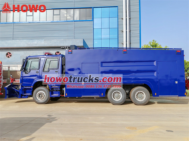 Howo Fire Water Zannon Riot жүк ташуучу унаасы 6x4 трансмиссиясы бар оор жүк ташуучу Sinotruk шассисин колдонот жана 400 аттын күчү менен бааланган WP12S400E201 кыймылдаткычы менен жабдылган, бул өзгөчө кырдаалдар учурунда күчтүү мобилдүүлүктү камсыз кылат. жүк ташуучу унаа Кузов материалдары, түзүлүшү жана системалары боюнча ар тараптуу жарылууга туруктуу дизайнга ээ, бул экстремалдык чөйрөдө миссияны коопсуз жана натыйжалуу аткарууну камсыз кылат. Айдоочулар атайын айдоо көндүмдөрүнө жана өзгөчө кырдаалдарга жооп кайтаруу мүмкүнчүлүктөрүнө ээ болушу керек, айрыкча алдын алуучу коопсуздук чараларына жана алыстан биргелешкен операцияларга басым жасалышы керек.