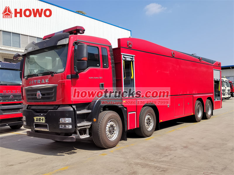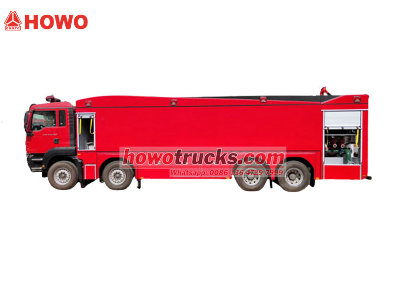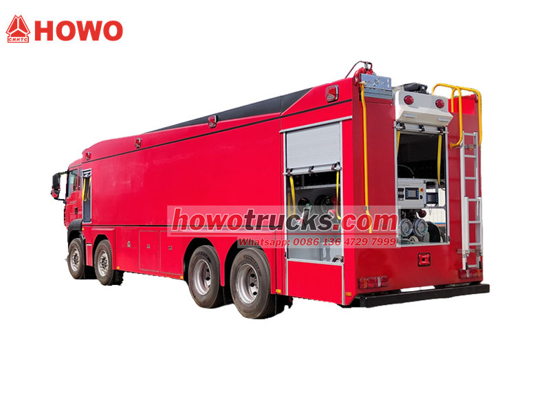 Howo 8x4 өрт өчүрүүчү суу соргуч жүк ташуучу унаасы бекем Howo TX кабинасынын 8x4 шассисинин негизинде курулган жана эң сонун кубаттуулук системасын интеграциялаган. 540 аттын күчүнө ээ MC13.54-50 кыймылдаткычы ашыкча жүктөлүп жатканда ар кандай татаал жолдордо күрөшө алат. Ал 12 000 литрлик чоң сыйымдуулуктагы суу багы жана 3000 литрлик көбүктүү бак, ошондой эле арткы жагына орнотулган 100 л/с чоң агымдуу өрт насосу менен жабдылган, ал 65 мге чейин чачыратуу аралыгына ээ. Башкаруу панелинин тили милдеттүү эмес жана ар кандай муктаждыктарды канааттандыруу үчүн ар кандай кошумча конфигурациялар каралган. Бул Howo орто кубаттуулуктагы 540 аттын күчүндөгү өрт өчүрүүчү суу ташуучу унаасы өрт коопсуздугу үчүн бекем коргоону камсыз кылат жана эң сонун иштөөнү жана ийкемдүүлүктү көрсөтөт.