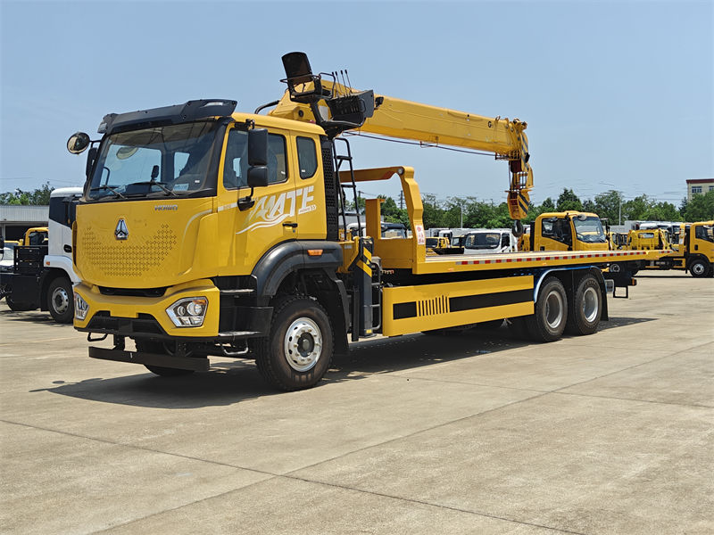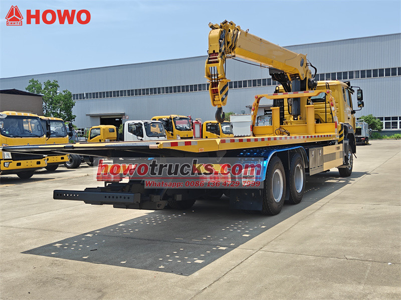 13000*2Бул Howo 8T кран менен платформалуу эвакуатор Бул ар тараптуу жана жакшы иштелип чыккан атайын жүк ташуучу унаа. Ал кытайлык Yuchai Engine брендинин дизелдик кыймылдаткычы менен жабдылган, 260 аттын күчүнө ээ, ал ар кандай жумуш муктаждыктарын канааттандыра алат. Жаңы M9 люкс кабинасы үч адамды батырат жана айдоочулар жана операторлор үчүн ыңгайлуу айдоо чөйрөсүн камсыз кылган кондиционер менен жабдылган. Кран - бул максималдуу көтөрүү кубаттуулугу 8000 кг, толук айлануу 360° жана максималдуу көтөрүү бийиктиги 16,5 м болгон телескопиялык жебе.