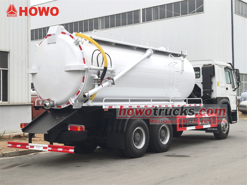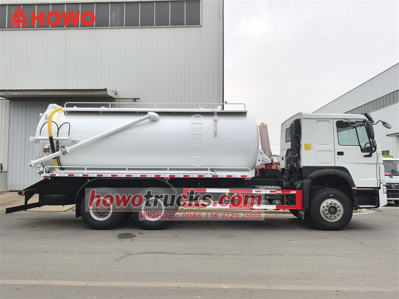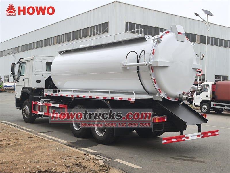HOWO 6x4 15 куб метрлик канализациялык соргуч жүк ташуучу унаасы HOWO HW76 кабина шассисинде өзгөртүлгөн. 4600+1350 мм дөңгөлөк базасы, Weichai WP10.340E22 кыймылдаткычы жана Sinotruk HW19710 10 ылдамдыктагы редуктору менен жабдылган. Үстүнкү кузову 15 куб метрлик канализациялык бактан, көмүртек болоттон жасалган материалдан, калыңдыгы 5 мм. Бакты көтөрүп, арткы эшикти ачса болот. 11 000 л/мин агым ылдамдыгы бар Jurop PN106D вакуумдук насосу менен жабдылган. Унаа ошондой эле көрүү түтүгү, тепкич, арткы эшиктин чыгаруу клапаны жана айдоочу тарабында кол менен башкарылуучу гидравликалык башкаруу рычагы менен жабдылган (арткы эшикти ачуу/жабууну жана бакты көтөрүү/түшүрүүнү башкаруу үчүн).